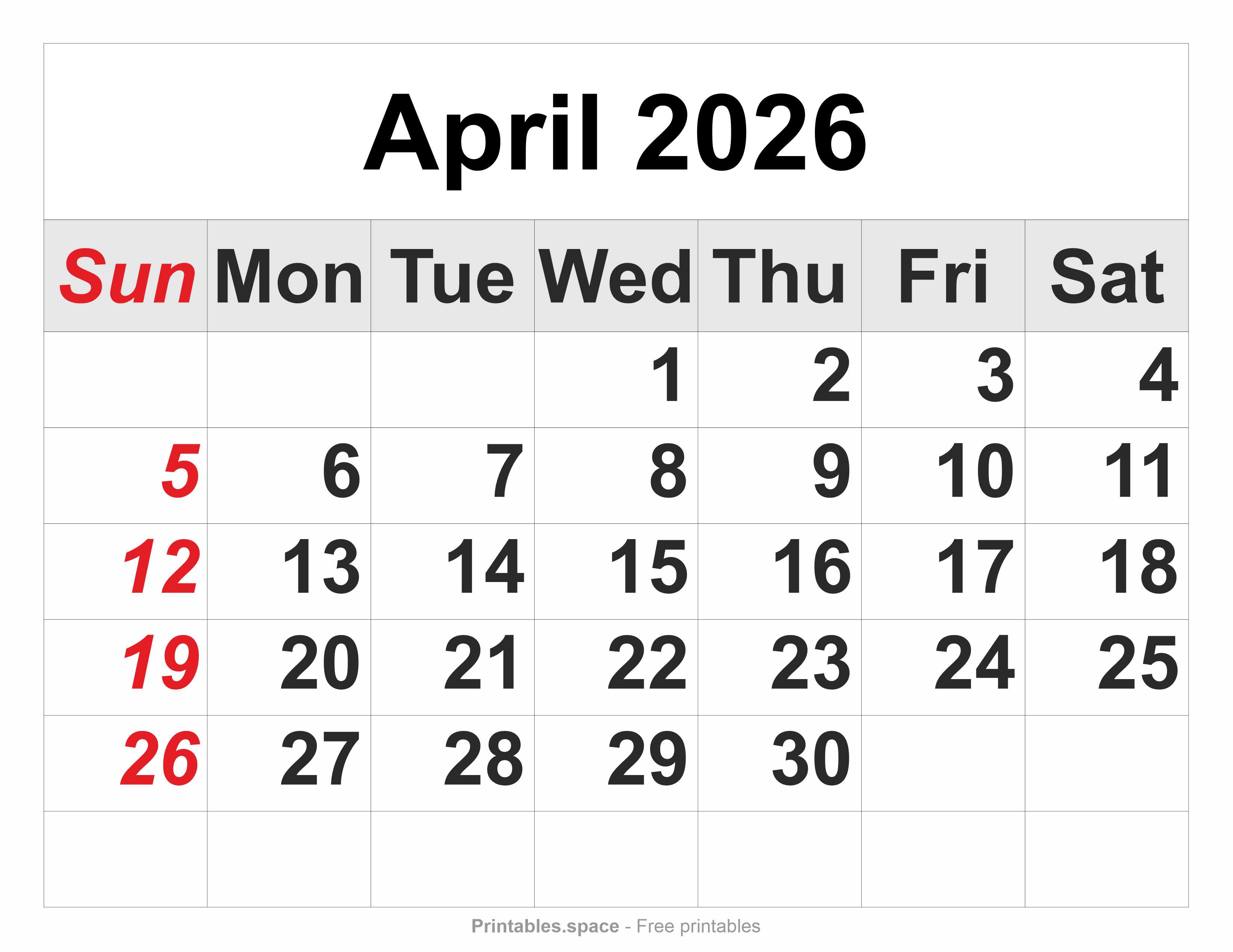Free printable April 2026 calendar – full-page layout optimized for US Letter. Features large, easy-to-read numbers and weekday letters. Sundays are highlighted in red (appears as dark gray when printed in black & white).