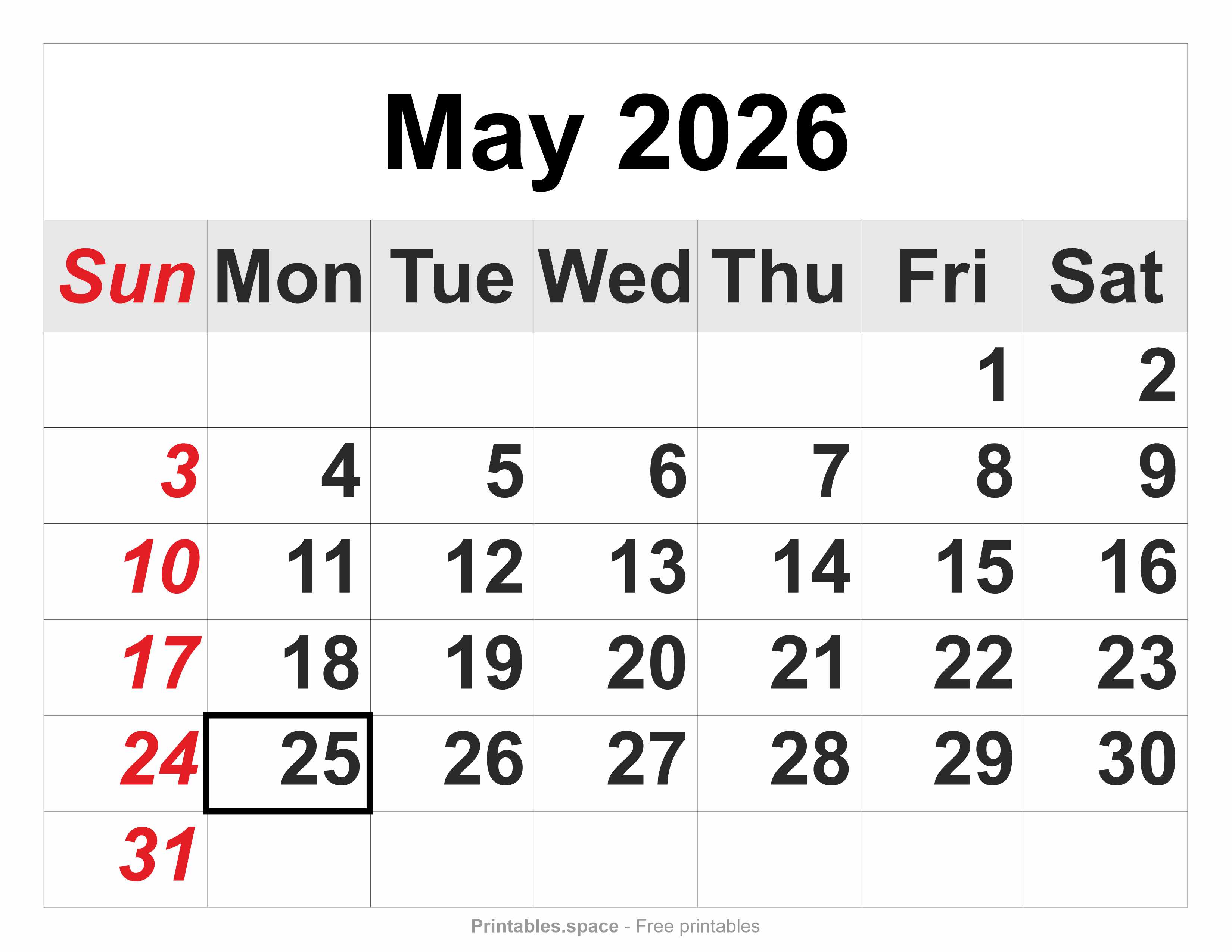 Includes Memorial Day (May 25) marked with a subtle circle.