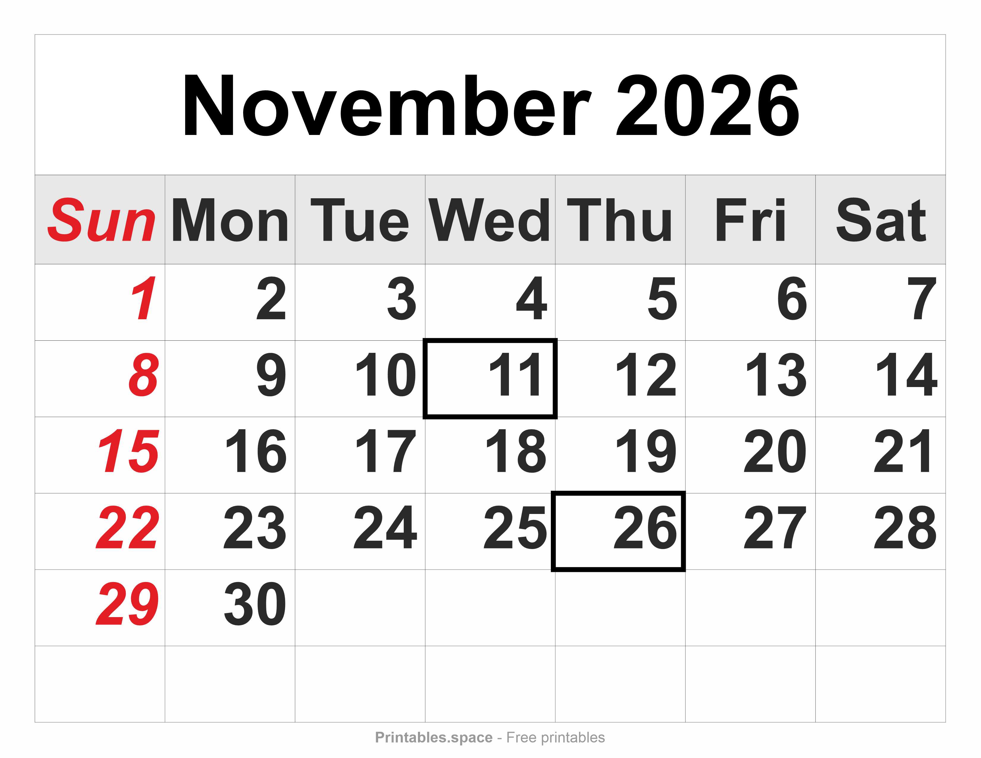 Free printable November 2026 calendar – full-page layout optimized for US Letter. Features large, easy-to-read numbers and weekday letters. Sundays are highlighted in red (appears as dark gray when printed in black & white).